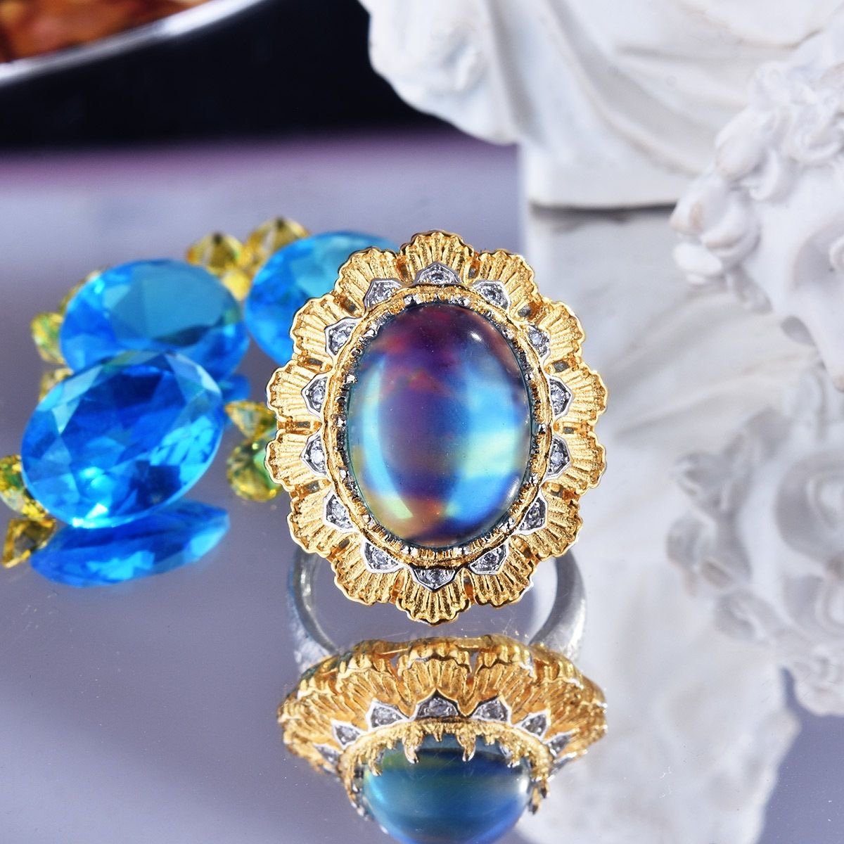 Carved gold hand-drawn moonstone French antique two-color gold lace ring quantity